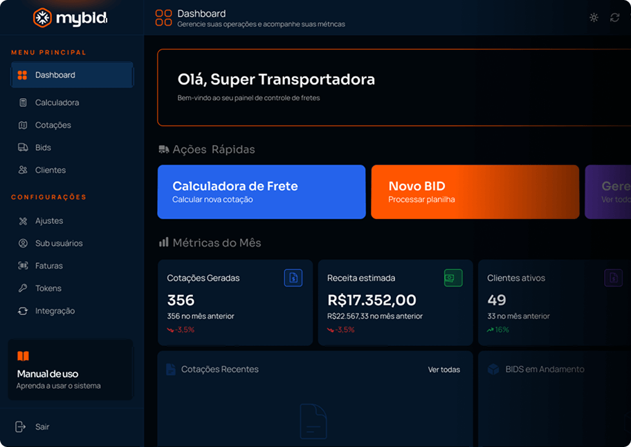 A MyBid é a sua sala de controle estratégica para BIDs de frete. Substituímos a complexidade por uma plataforma intuitiva que automatiza o trabalho pesado.
