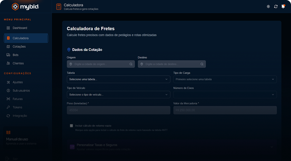A MyBid é o único sistema de precificação de frete que integra todas as variáveis críticas do transporte rodoviário em uma plataforma inteligente. Nosso software calcula automaticamente distância, pedágio, diesel, ICMS, ISS, custos operacionais, produtividade e margens — transformando dados complexos em propostas técnicas e precisas em minutos.